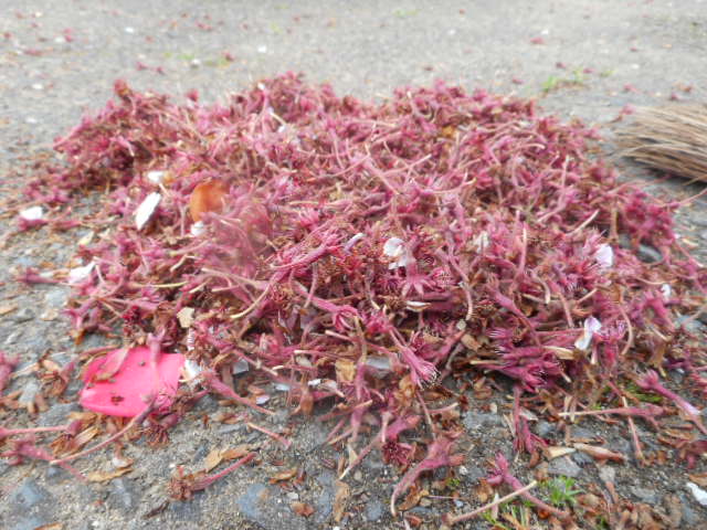 吹き溜まりには 桜の花びらが 小山にも。ビックリ、今まで 花びらの小山までは気が付かなくて。