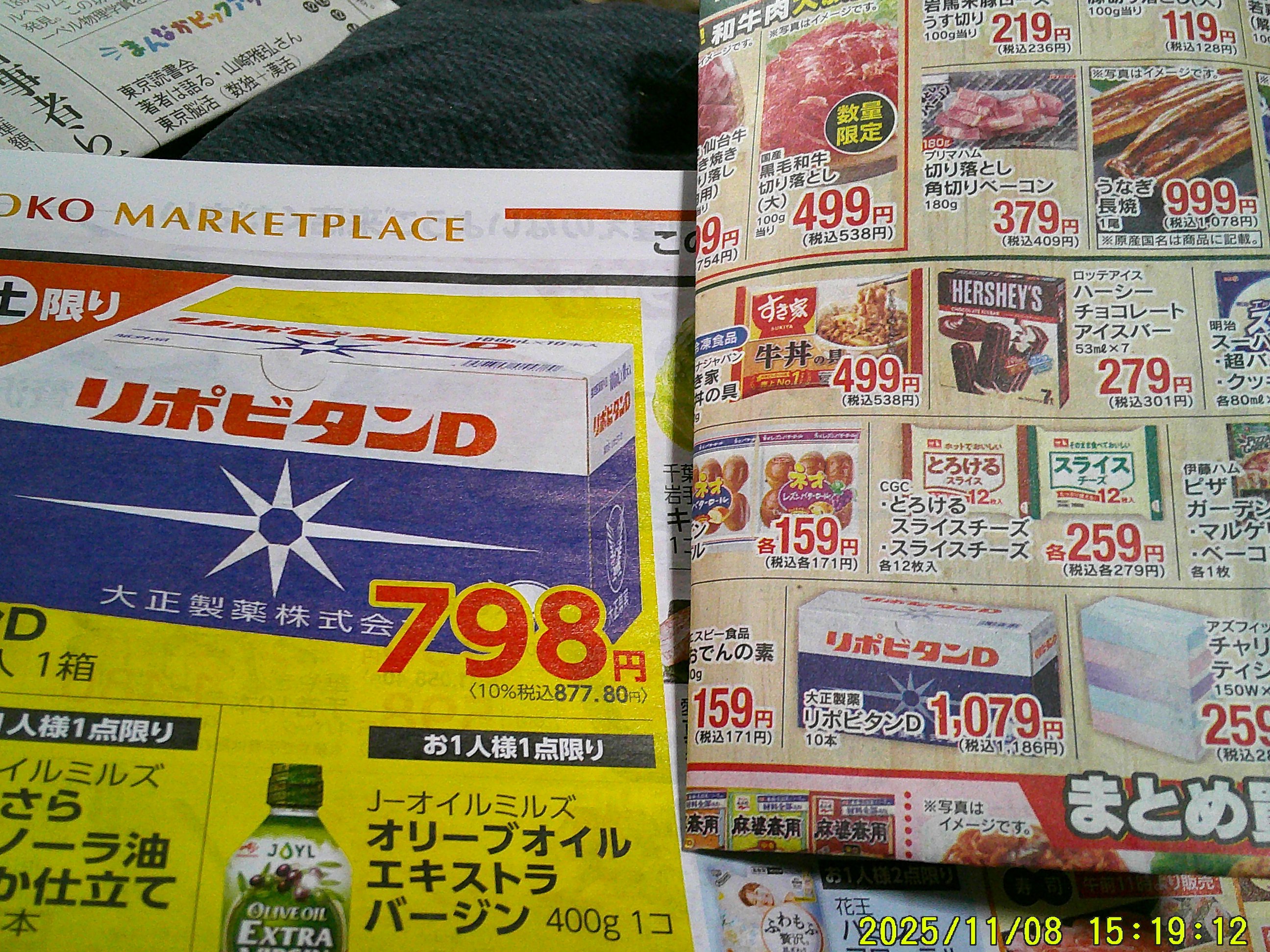 リポビタン。近くのスーパー1186円。ヤオコー877円。お一人様1箱のみ。もう1度入店して。