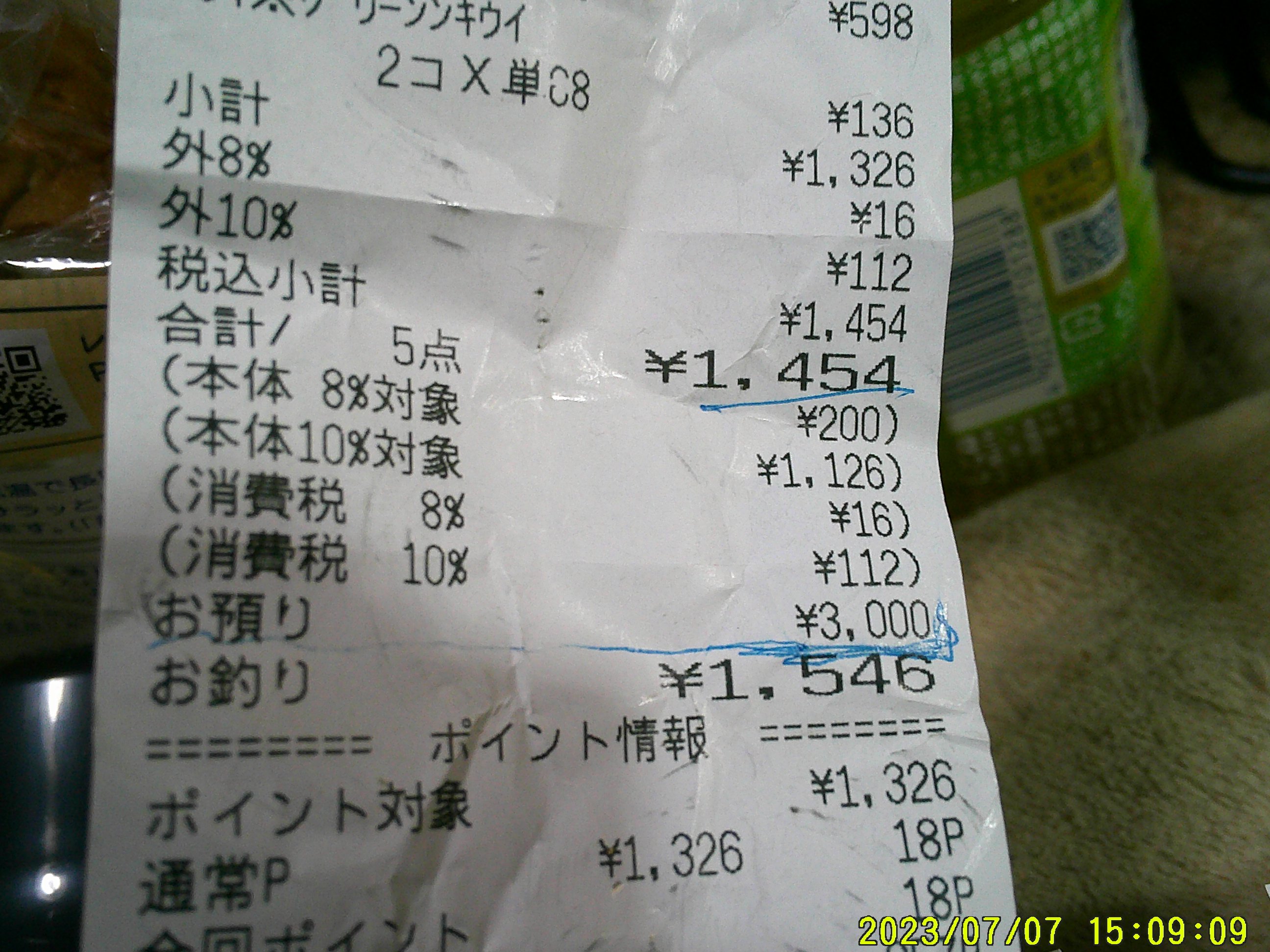 1454円なので 2千円支払った。 ところが お預かり3000円と。