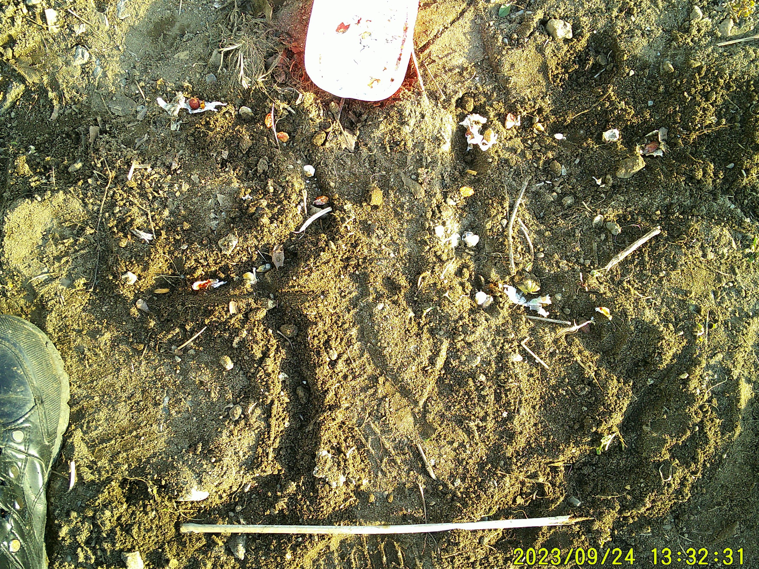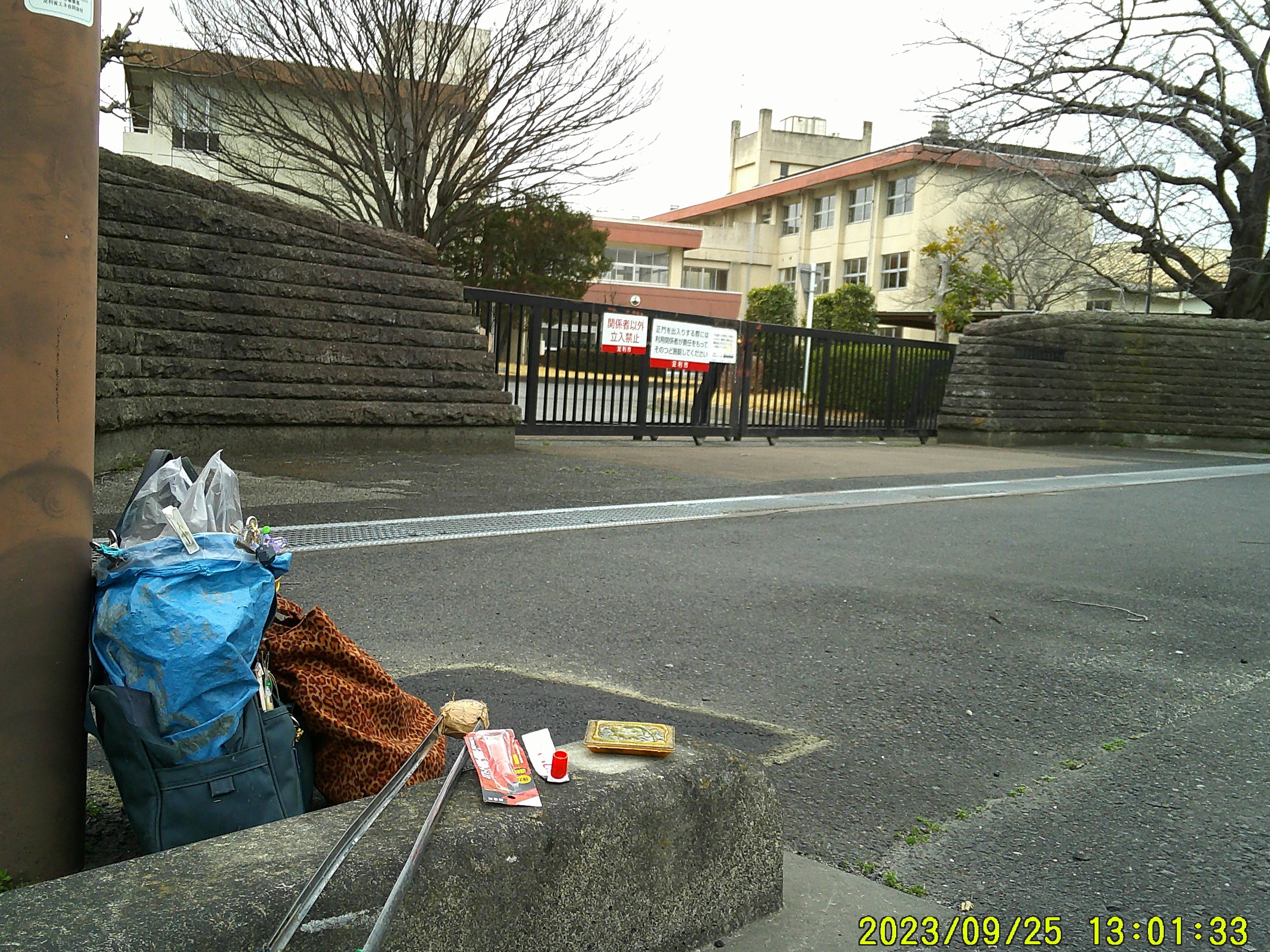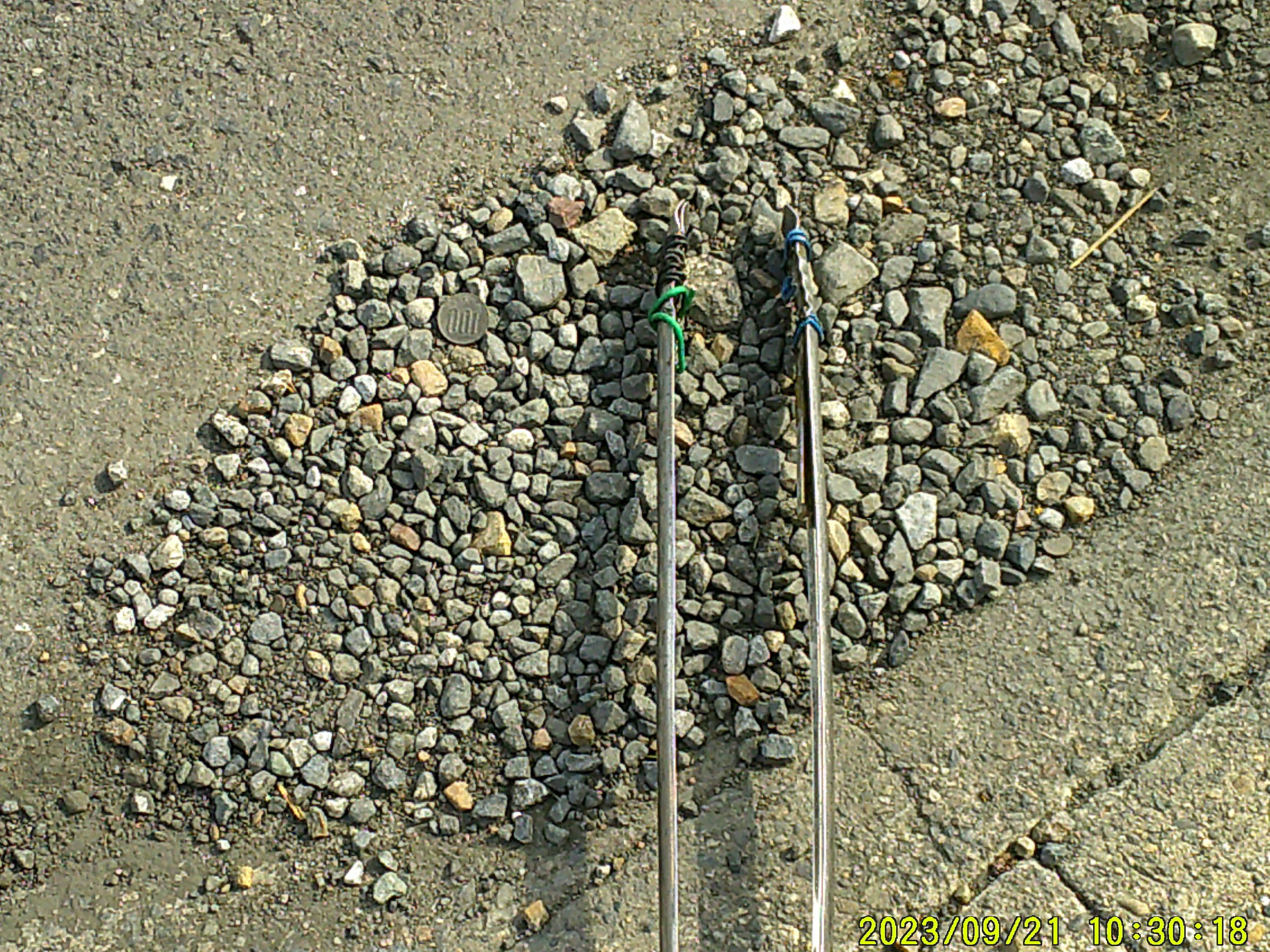 山前アンダーパス。手前の公民館 前で、沢山の丸小型 金属片。