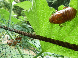 カボチャ畑で、ネットにシガミついて脱皮。カボチャの葉の裏で脱皮。背中が立て割れ。都合 セミは4匹脱皮した。