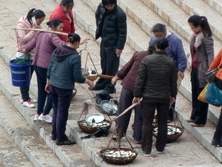 「竹イカダ」の運航手や客引きの女性達、サッパリ収入が無くて、5日7日と大勢が集まって、「収入を!」。キット 団体の御客さん達は別な場所で「竹イカダ」「中型観光船」に乗って、、、、ガイドさんも 客1名につき68元もの値上がりには耐えられないのでは、、、昼食は1名10元前後ですから。仮に30名の団体さんですと、、、
