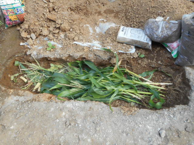 掘った溝に トウモロコシの茎を入れて 将来の肥料に。