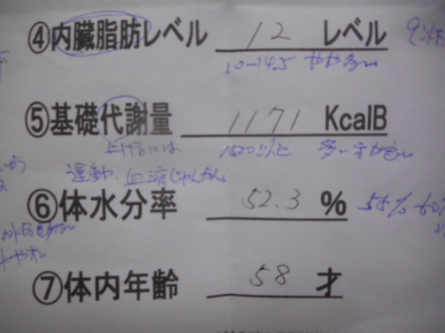 内臓脂肪レベルは「やや多い」、減らしたい。基礎代謝量は低い、運動して多くする。体水分率は低いので血中の水分も少ないので血管が切れやすい、、、、体内年齢は58才と嬉しいが。