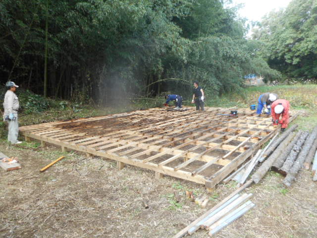 上床の打ち込み杭の跡が多数、厚手のベニヤ板が33枚、杭が約100本位か。33枚のベニヤ板に長い木ねじが約1000本。電動ドリルで、御苦労さま。