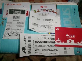 500円券、スーパーマーケット3種、ヤオコー、ヤマグチ、アオキ。玉ねぎに「芽」。