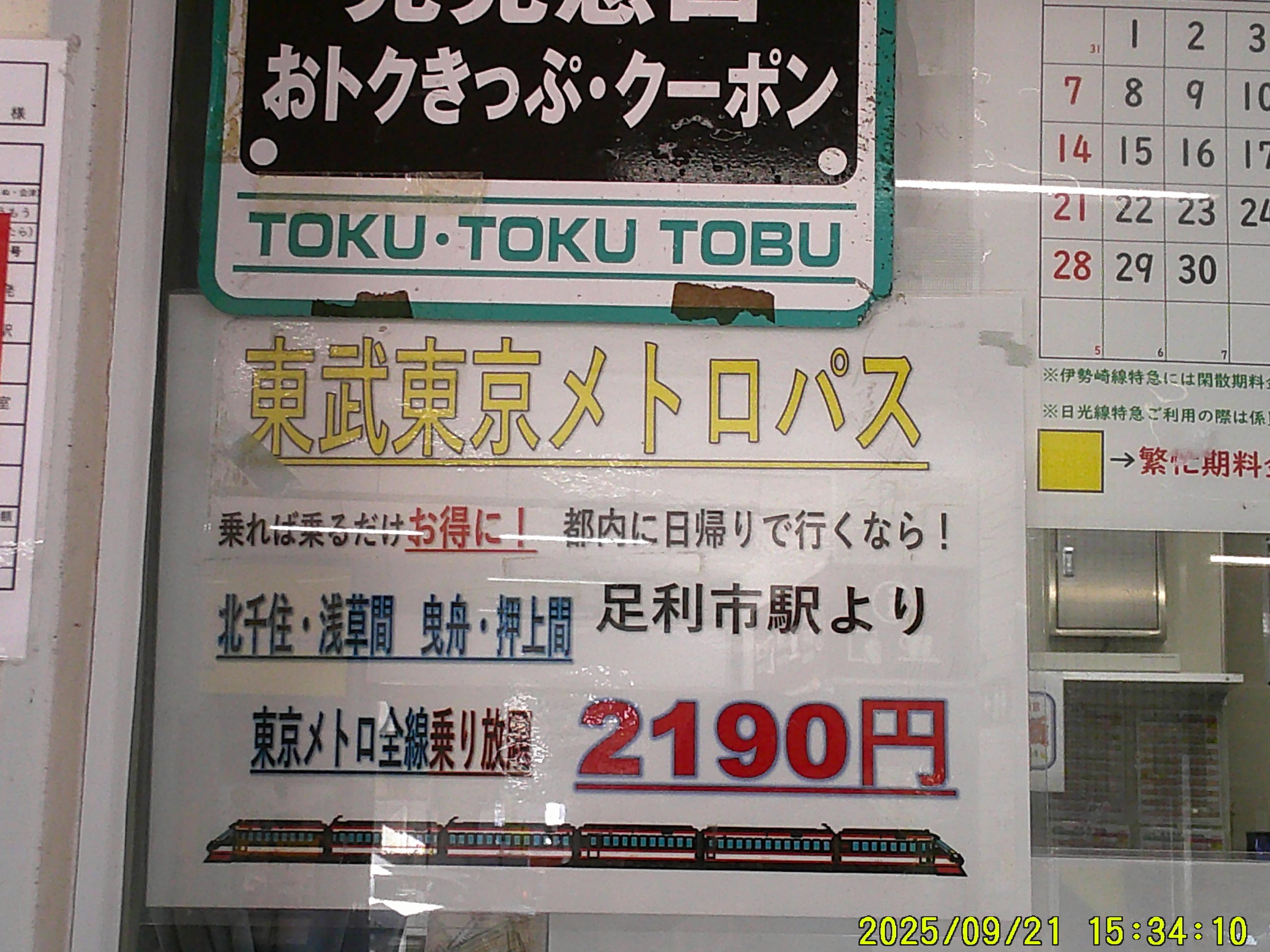足利市駅に 初めて。バイクの駐車スペース?探したが 不明。料金が 足利市駅から 東京メトロのパス フリー、往復込みで2190円。北千住まで 片道で1050円、地下鉄料金は別で。