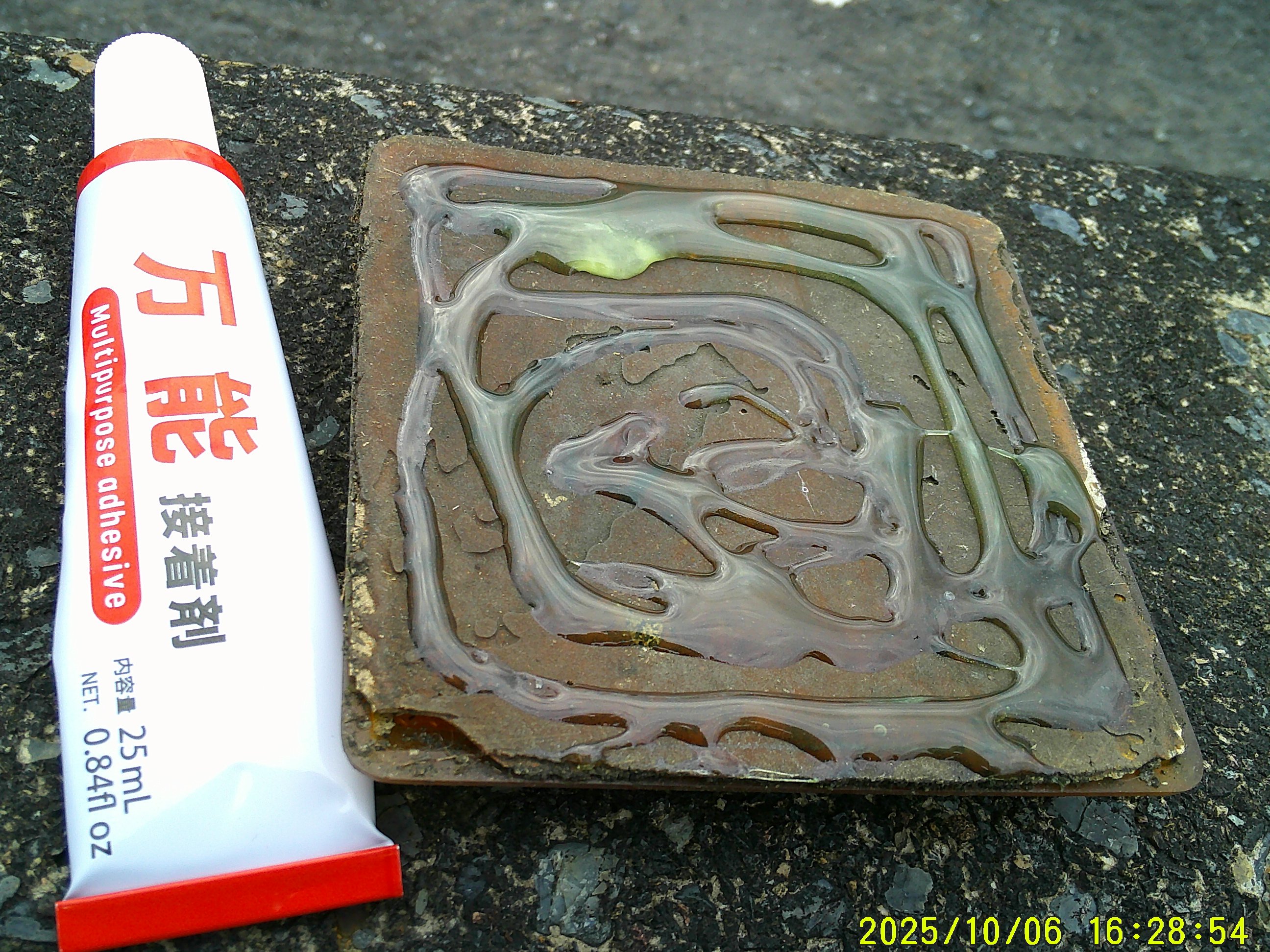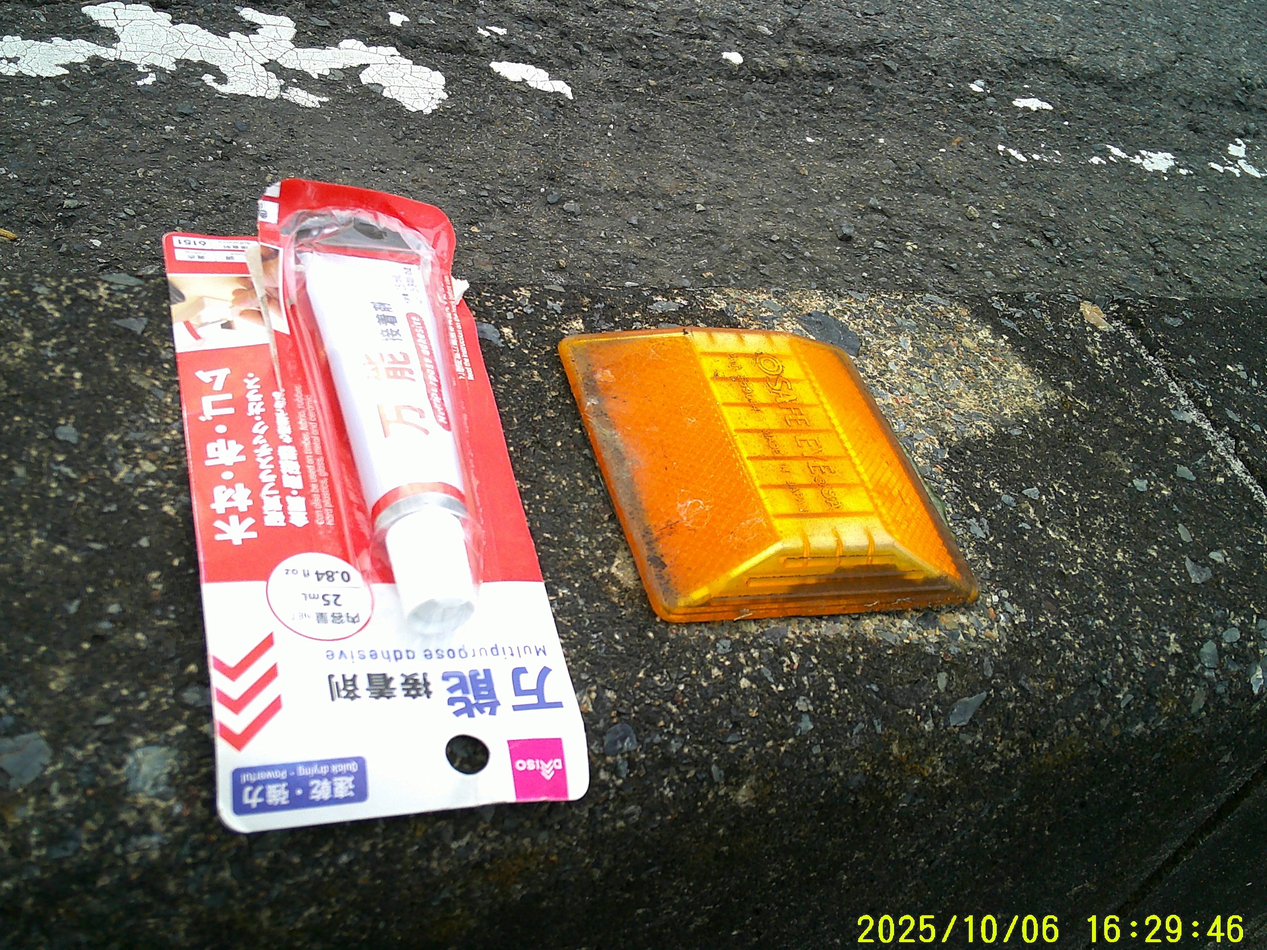 万能接着剤。貼り付け式「道路標識」。剥がれている。