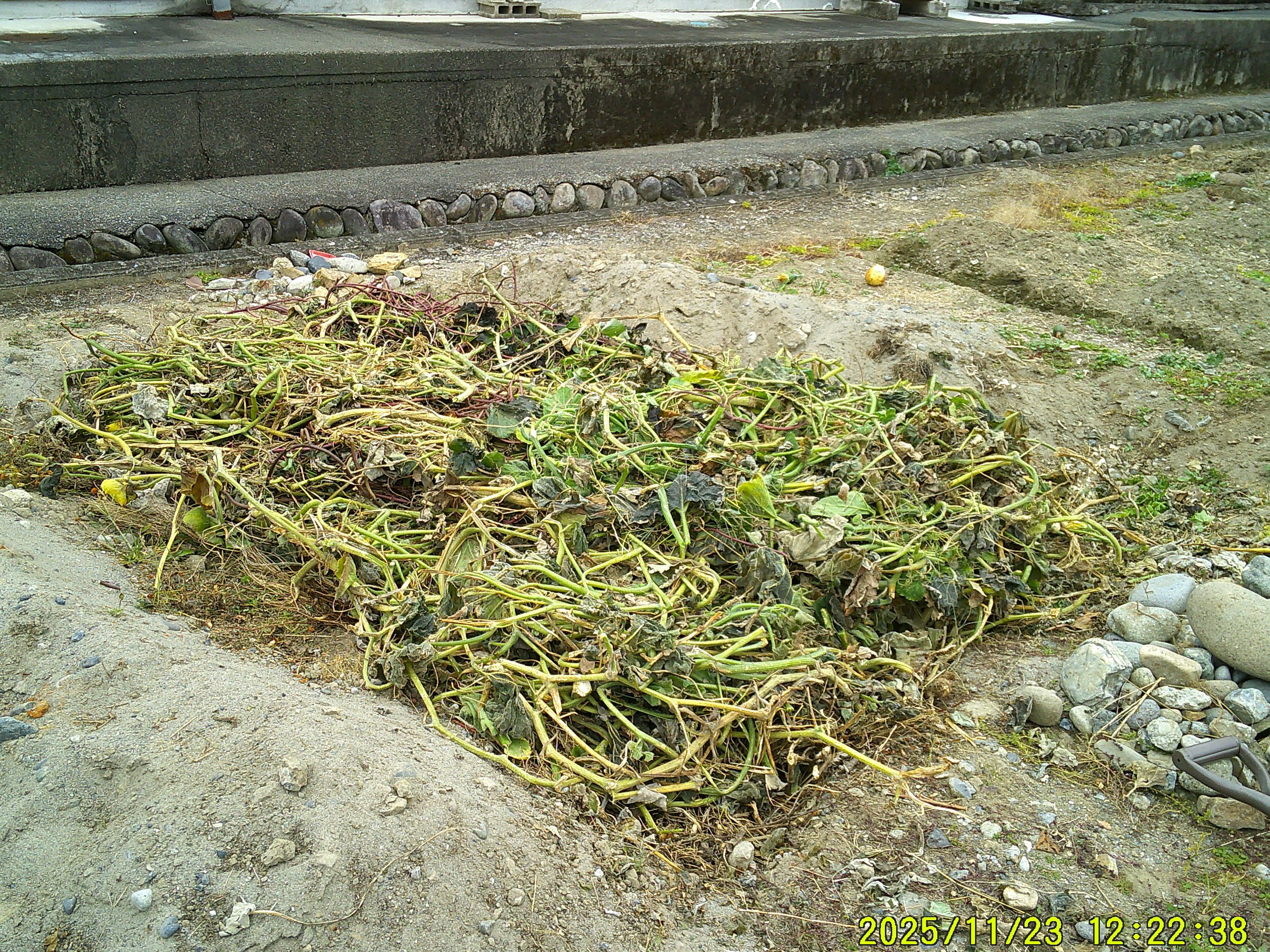 大家さんの空き地に、「畑」かぼちゃの蔓と葉を、来年の肥料にと、