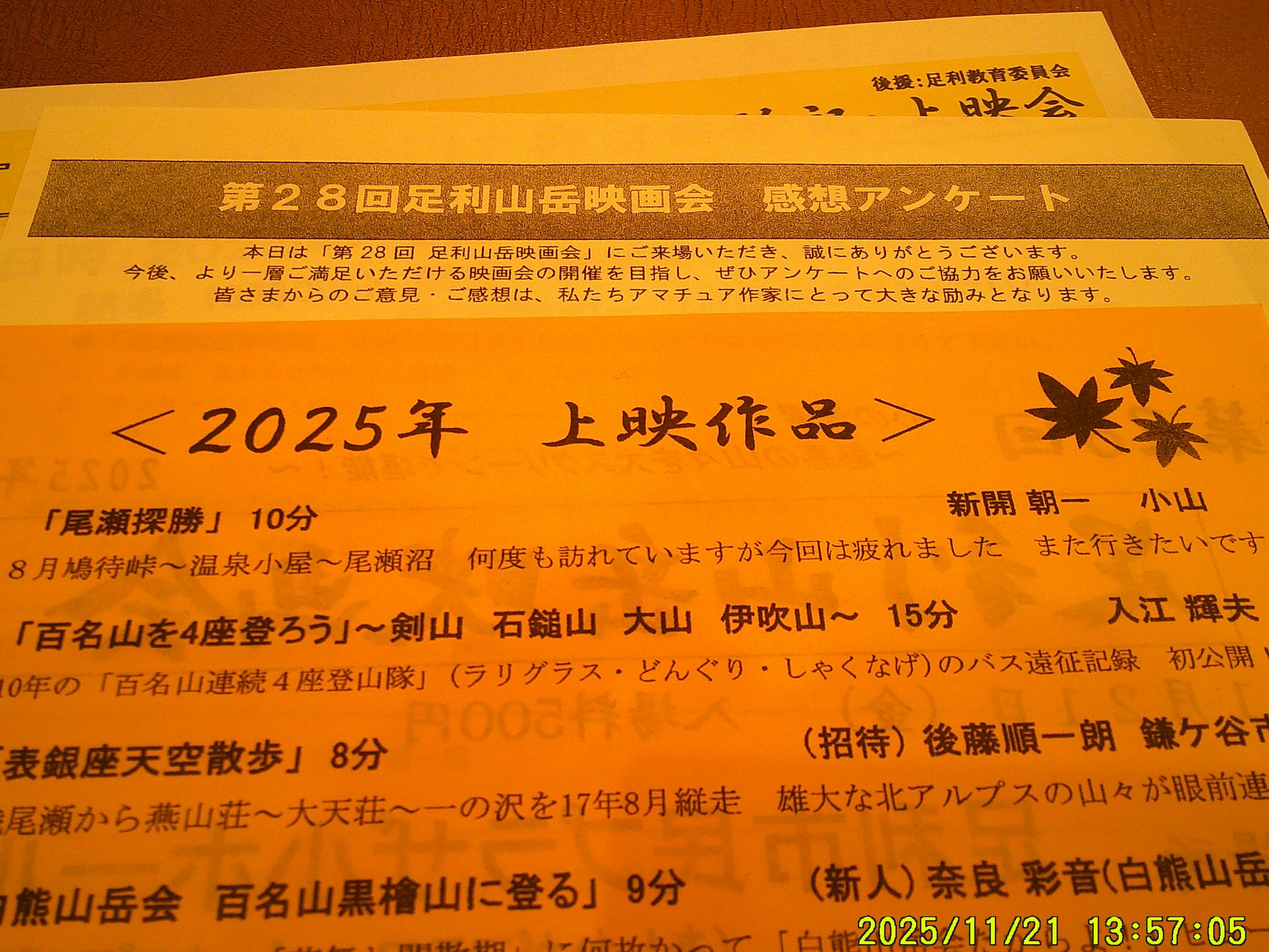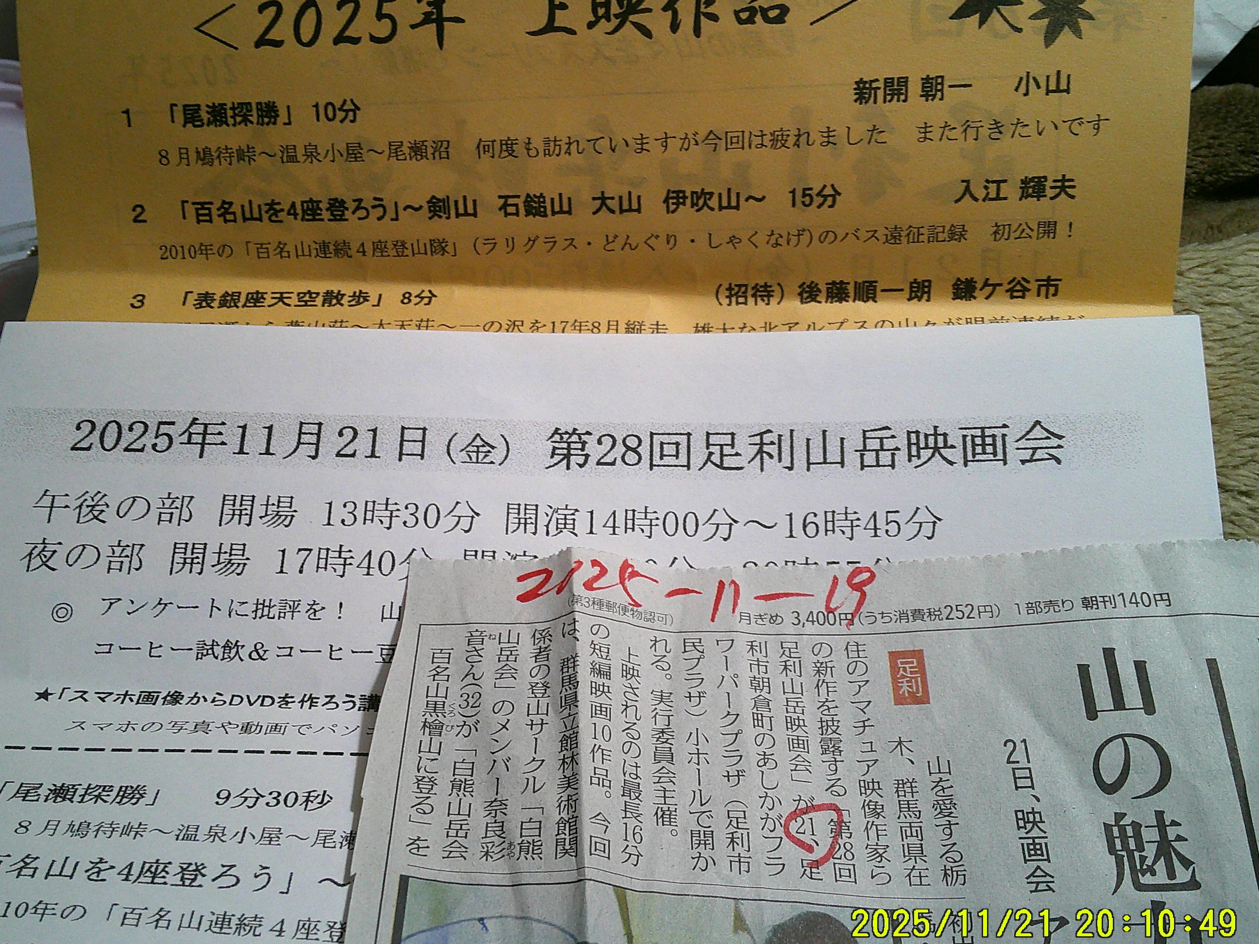 足利山岳映画会。21日 500円。期待のし過ぎ、、、